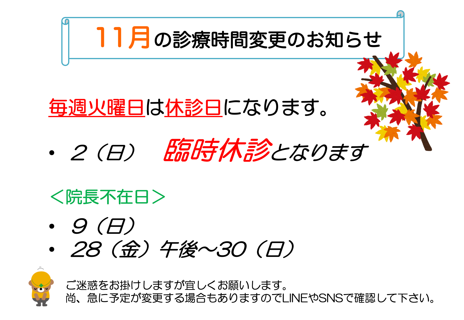 11月の診療時間変更と院長不在日2025年10月4日/カテゴリ: お知らせ/作成者: DAIKIANIMALCLINIC 0 0 DAIKIANIMALCLINIC DAIKIANIMALCLINIC2025-10-04 17:33:252025-10-04 17:33:2511月の診療時間変更と院長不在日