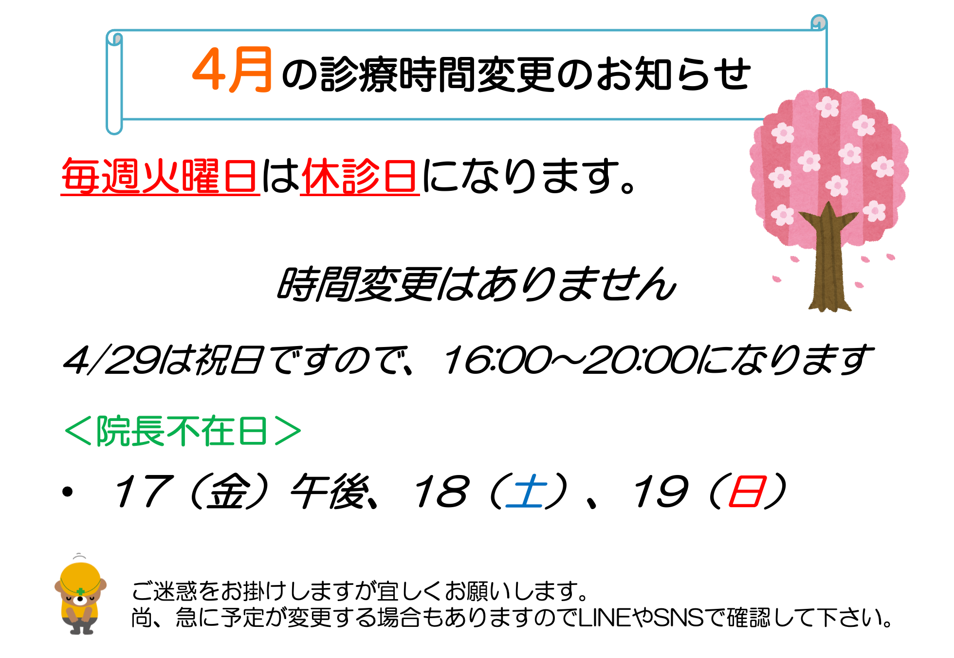 5月の院長不在日と診療時間変更のお知らせ2026年4月20日/カテゴリ: お知らせ/作成者: DAIKIANIMALCLINIC 0 0 DAIKIANIMALCLINIC DAIKIANIMALCLINIC2026-04-20 23:16:432026-04-20 23:16:435月の院長不在日と診療時間変更のお知らせ